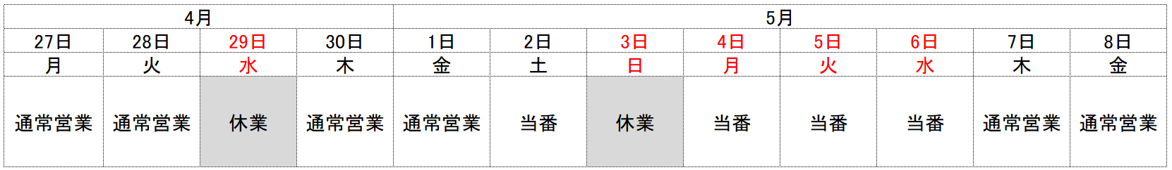 ※休業(当番対応)・・・緊急修理のみ、当番対応で受け付けます。 ※休業・・・お電話いただいた場合、留守番電話につながります。翌営業日以降に対応致します。
